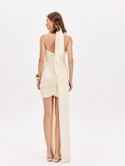 O modelo apresenta alças finas com delicados detalhes metálicos dourados, um folho fluido na zona do peito e um corte assimétrico com cauda longa e esvoaçante, que cria um efeito visual sofisticado e marcante a cada passo. A parte frontal mais curta contrasta com a fluidez traseira, conferindo modernidade e um ar glamoroso à peça.