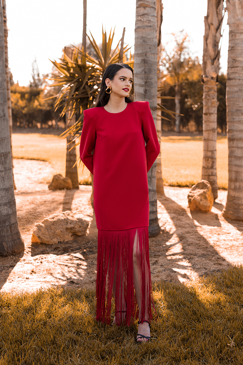 O design destaca-se pela parte superior minimalista e estruturada, com linhas limpas, ombros marcados e corte direito, criando uma estética moderna, forte e extremamente elegante. A aplicação de franjas no comprimento adiciona movimento, fluidez e um toque de sensualidade sofisticada, elevando o vestido para um registo de elegância premium, ideal para ocasiões especiais. O comprimento midi torna-o ainda mais versátil, mantendo sempre uma imagem refinada e feminina.
