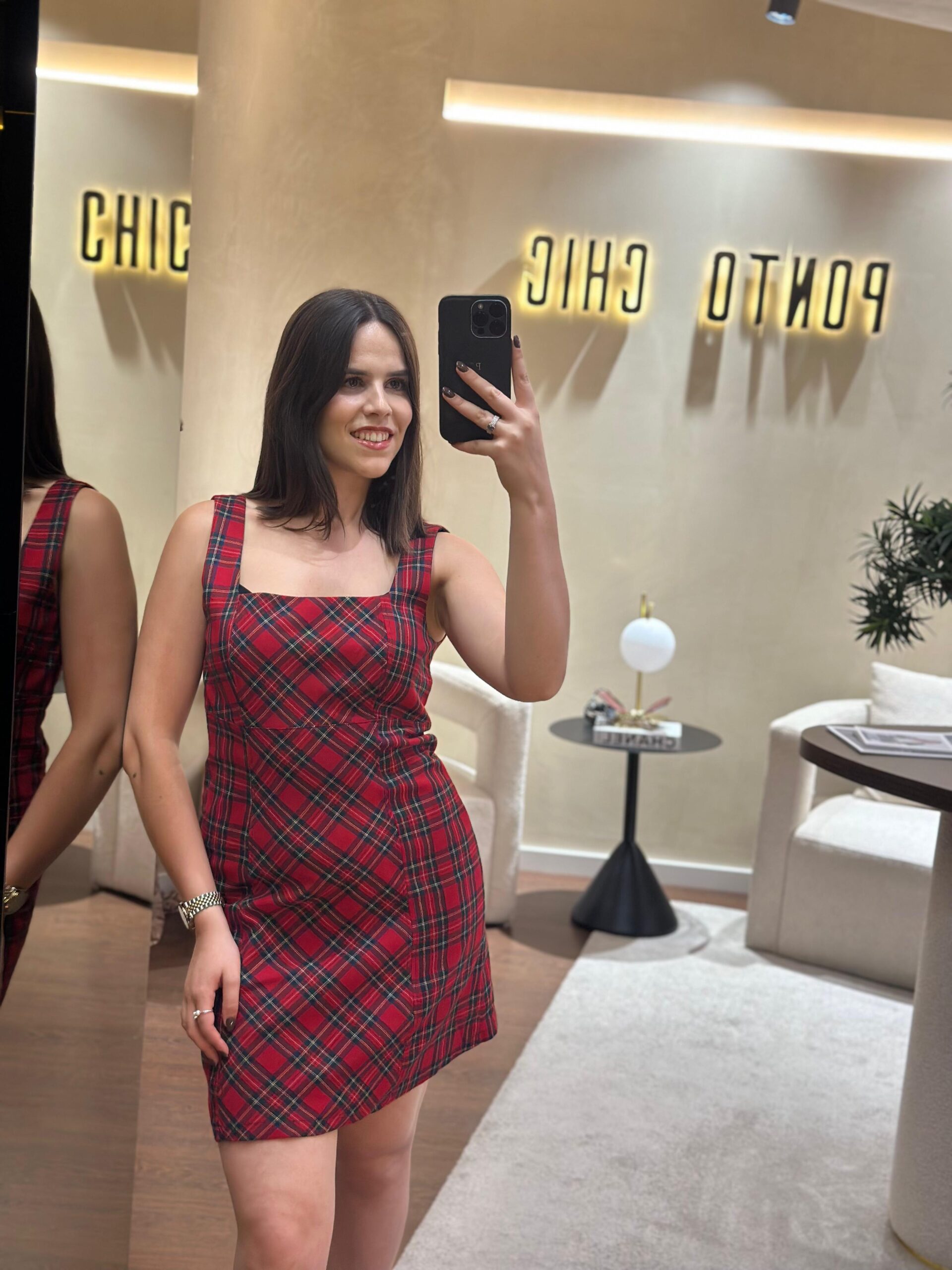 O vestido xadrez vermelho da marca Dixie é a peça statement que transforma qualquer look num ícone de estilo. O padrão tartan em tons intensos transmite ousadia e irreverência, enquanto o corte justo com alças largas e decote estruturado valoriza a silhueta de forma feminina e sofisticada.