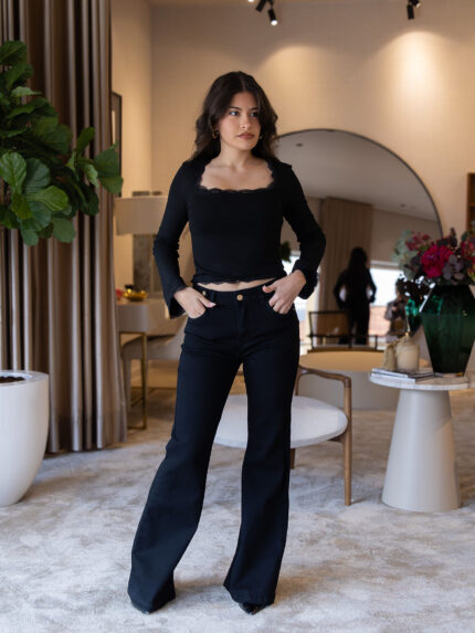 CALÇA DE GANGA FLARE PRETA COM BOTÕES DOURADOS PONTO CHIC