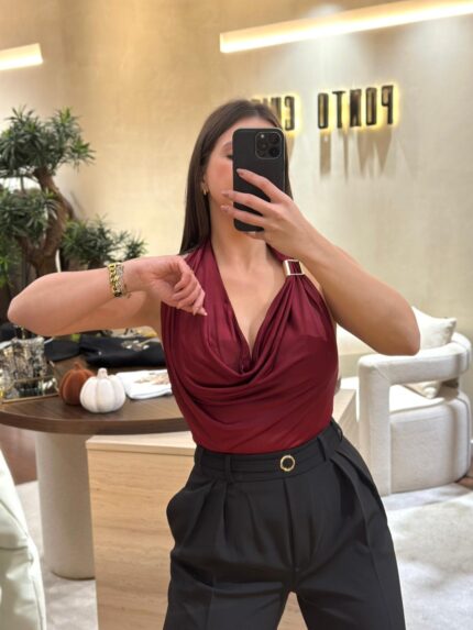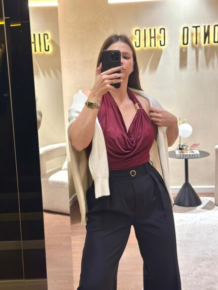 €59.90TOP BORDÔ DE GOLA HALTER COM DETALHE DOURADO PONTO CHIC