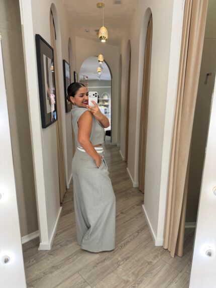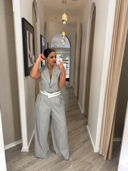 CALÇA CINZA CLARO EM TECIDO TEXTURADO COM DETALHE DE CINTURA IMPERIAL