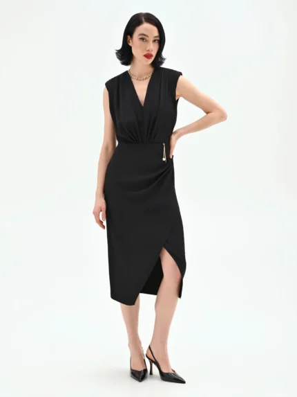 VESTIDO PRETO COM DECOTE PROFUNDO E DETALHE DOURADO RINASCIMENTO
