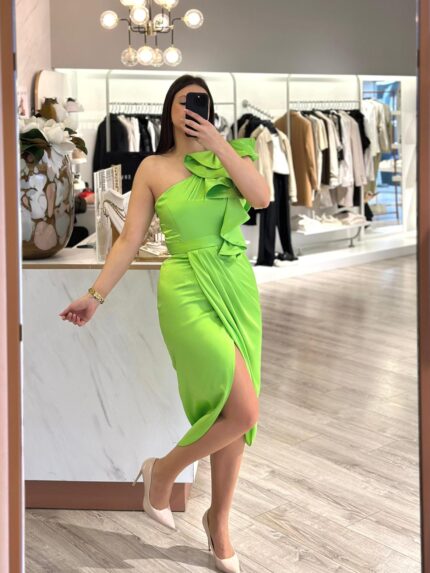VESTIDO MIDI VERDE LIMA ASSIMÉTRICO COM FOLHOS PONTO CHIC